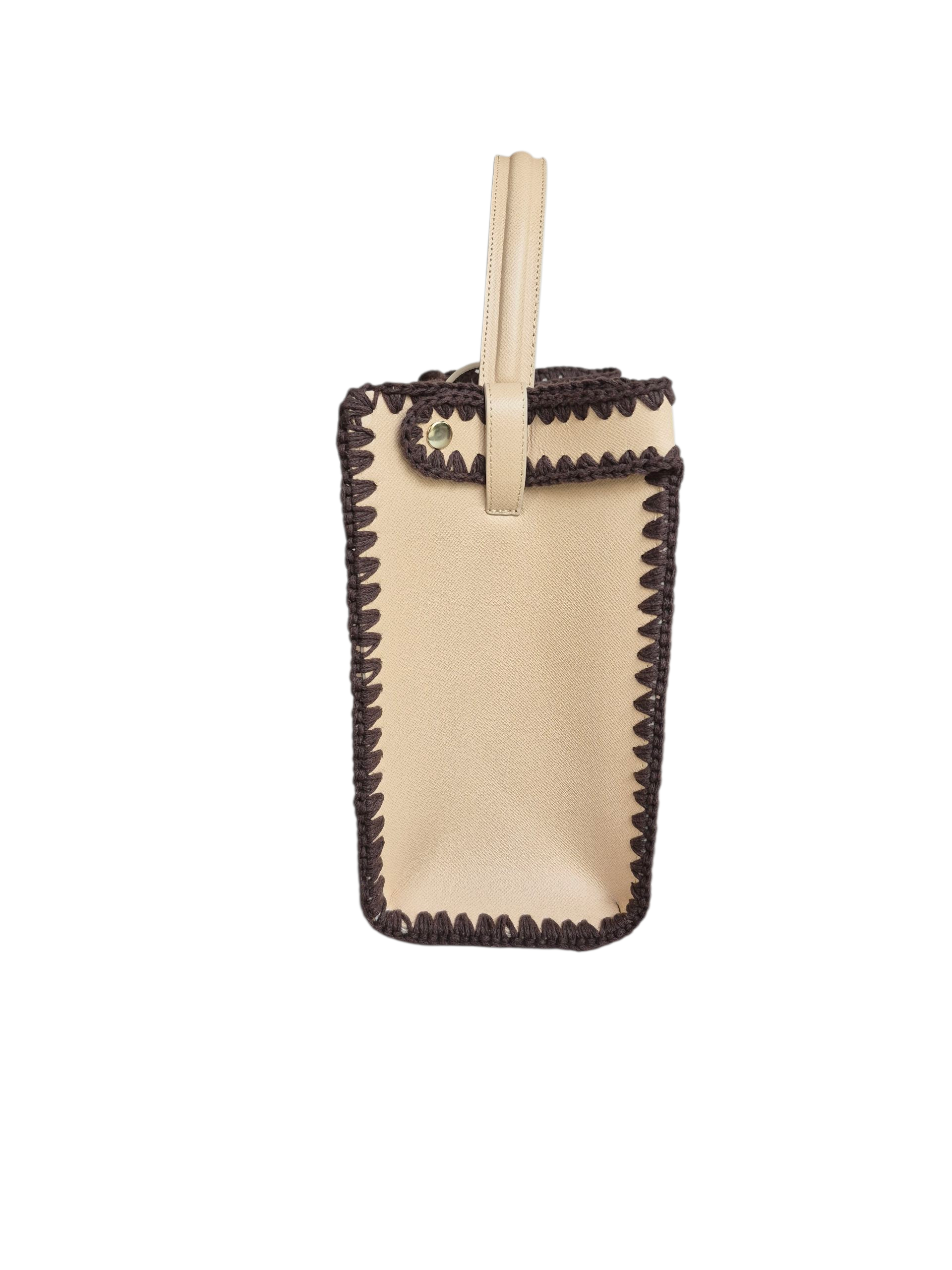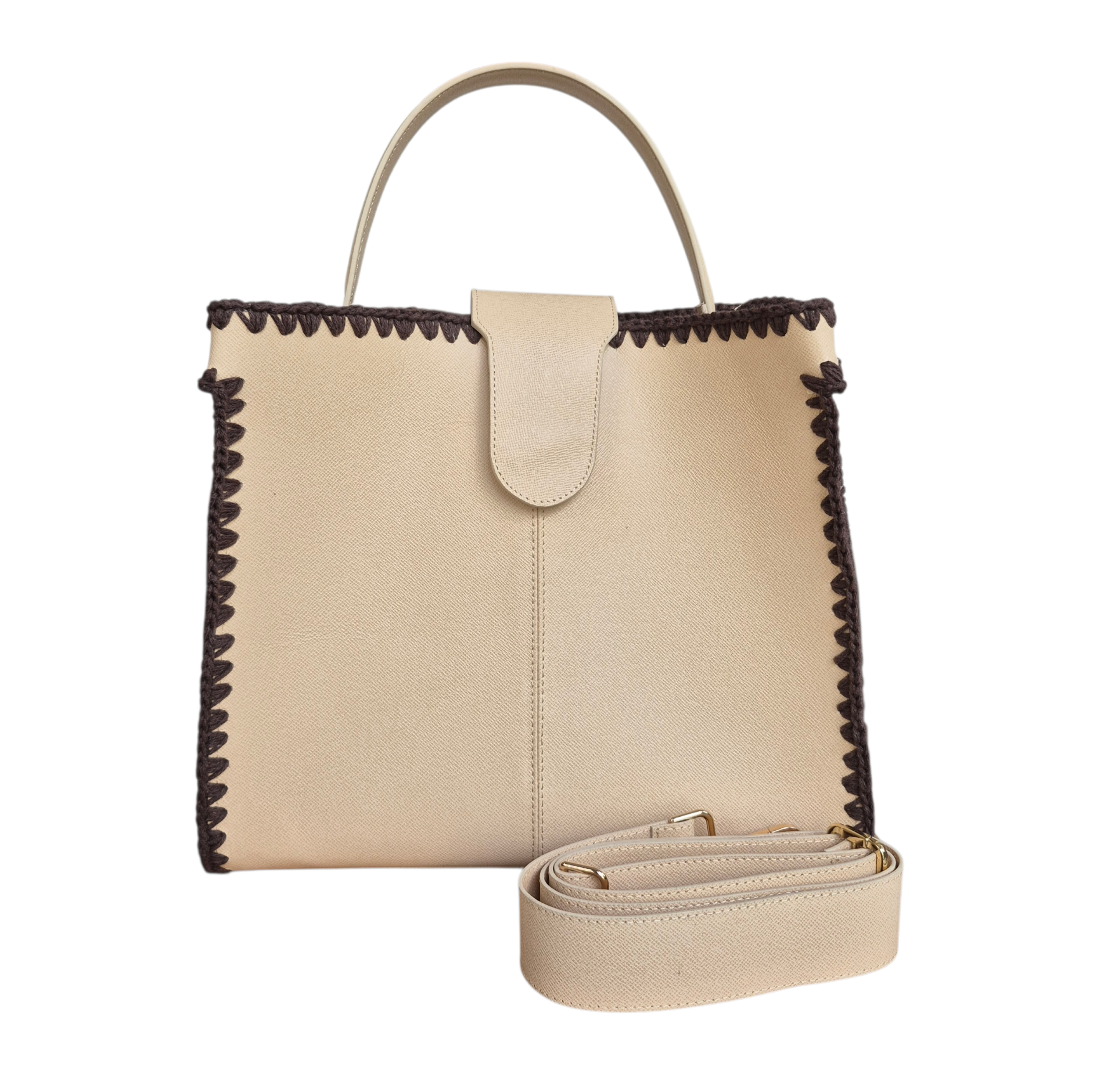 Kenarlarında yer alan kahverengi battı–çıktı örgü detayları, çantaya doğal bir karakter kazandırırken ustalıkla yapılan el işçiliğini ön plana çıkarır. Kaliteli derisi, dengeli formu ve zamansız tasarımı ile uzun yıllar keyifle kullanılabilecek özel bir parçadır.